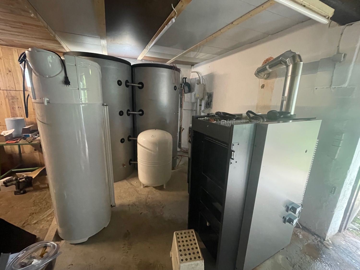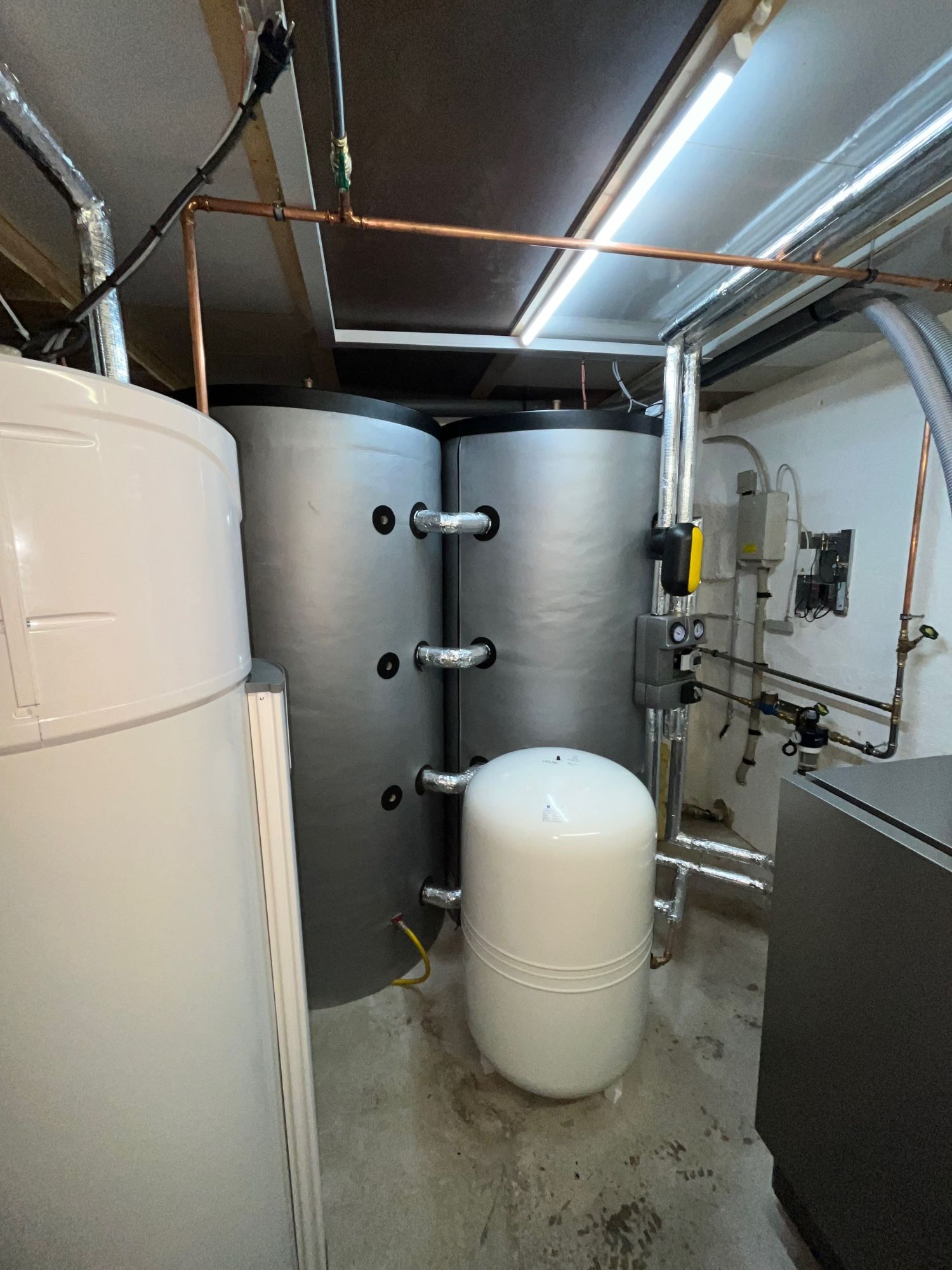Herzstück der Anlage ist ein Pufferspeicher mit 2.300 Litern Volumen, kombiniert mit einer Warmwasser-Wärmepumpe Explorer Evo 2. Diese übernimmt im Sommer die Warmwasserbereitung, wenn die Holzheizung außer Betrieb ist. Während der Heizsaison nutzt die Wärmepumpe die Wärme aus dem Holzsystem – eine intelligente und energiesparende Kombination.