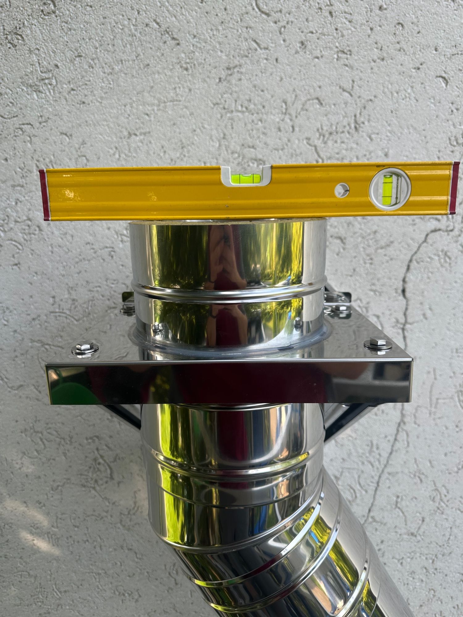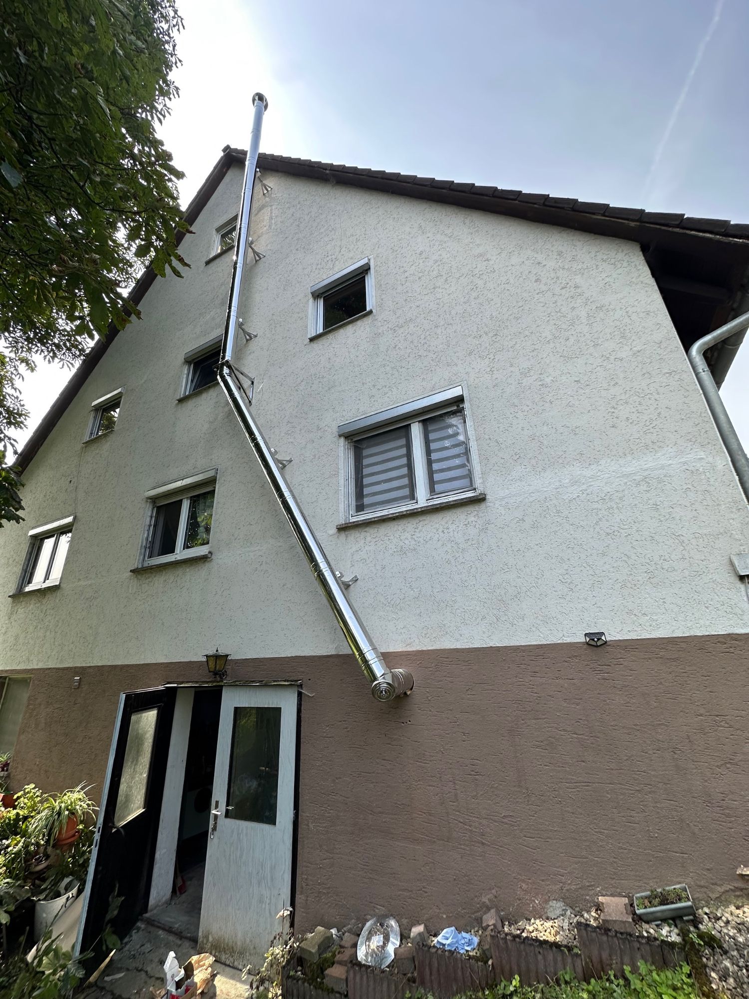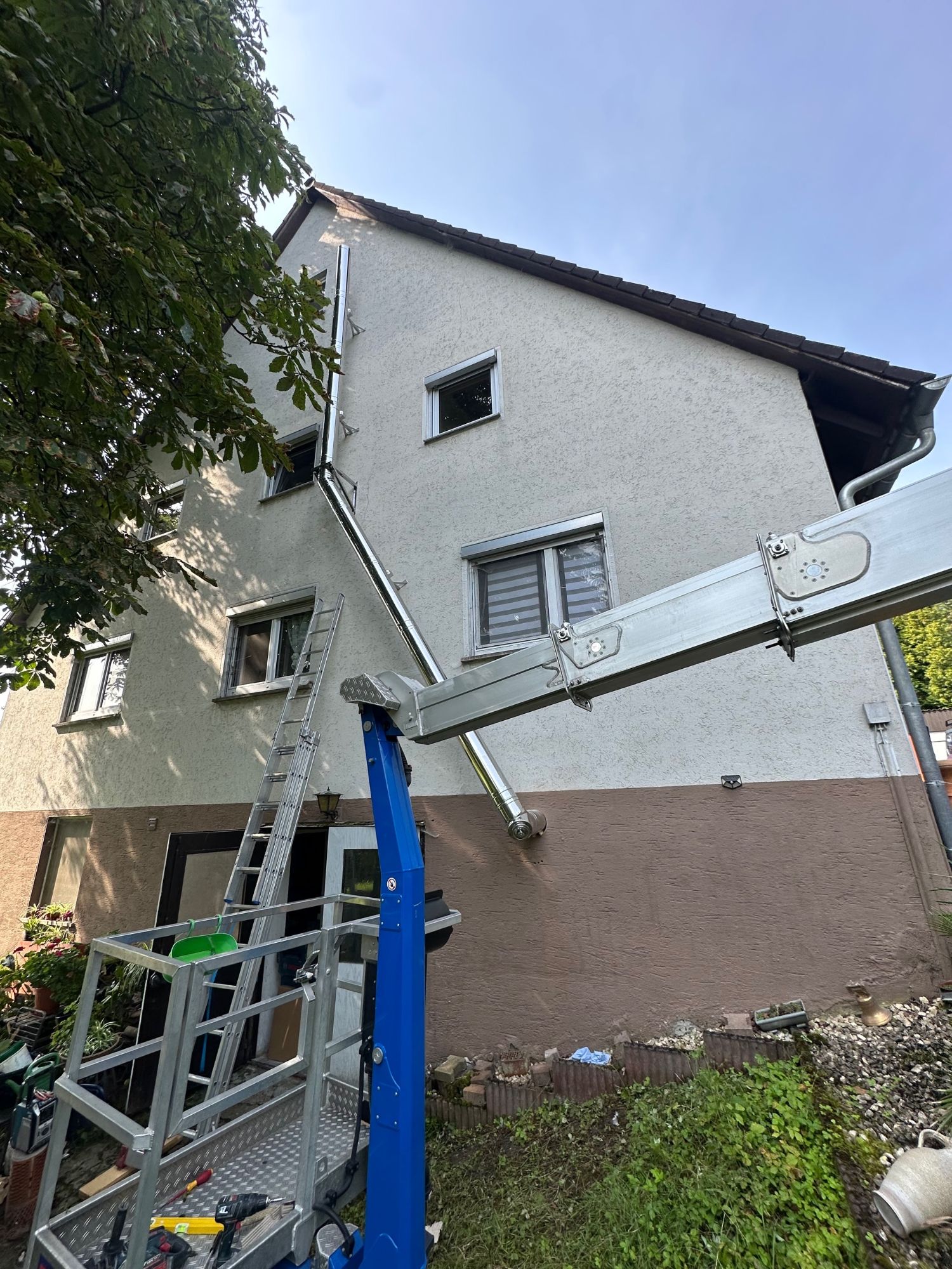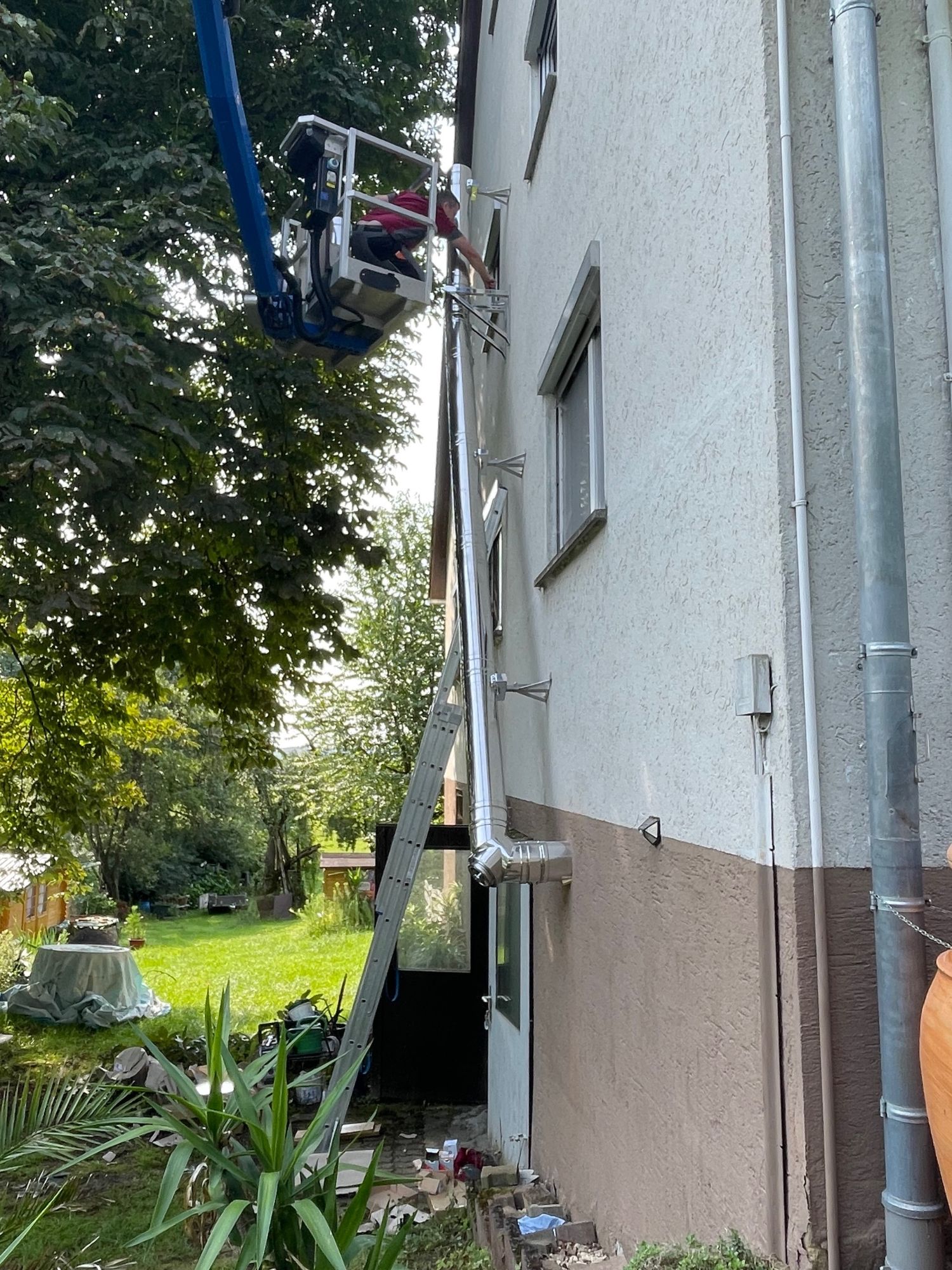 Da der Kaminzug an der Hausfassade verläuft, wurde in Abstimmung mit dem örtlichen Schornsteinfeger ein Edelstahl-Außenkamin montiert. Die Montage erfolgte mithilfe einer Hebebühne, um ein sicheres Arbeiten an der Fassade zu gewährleisten.