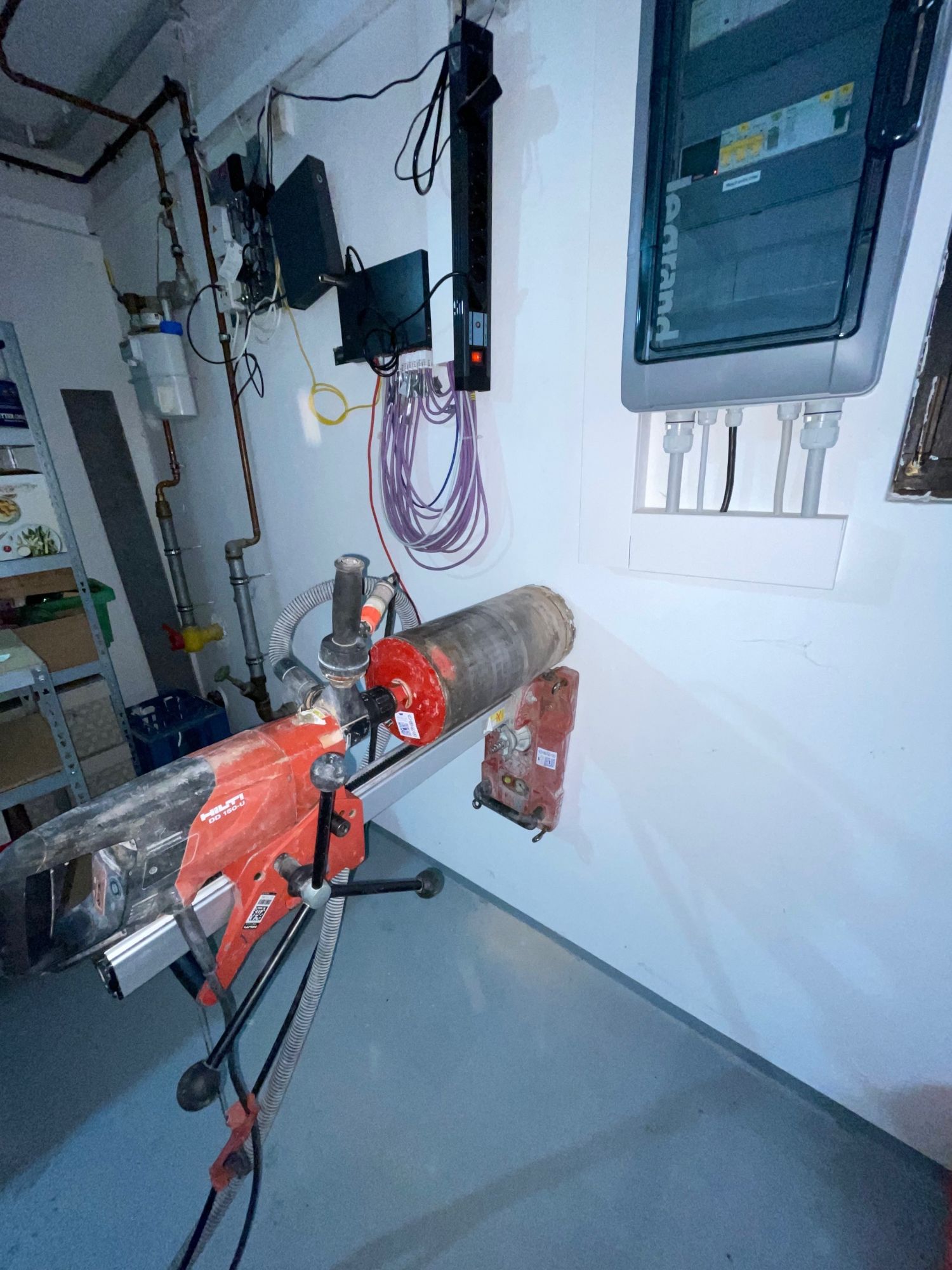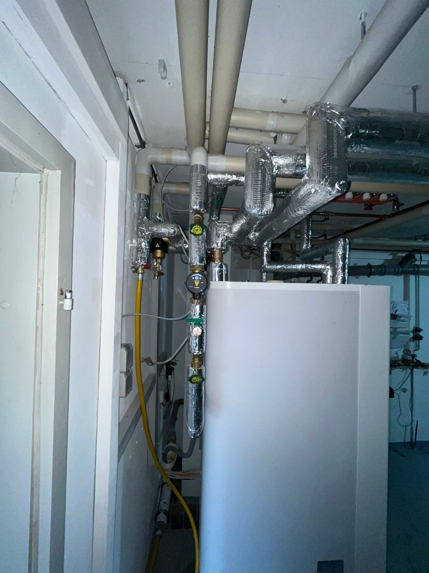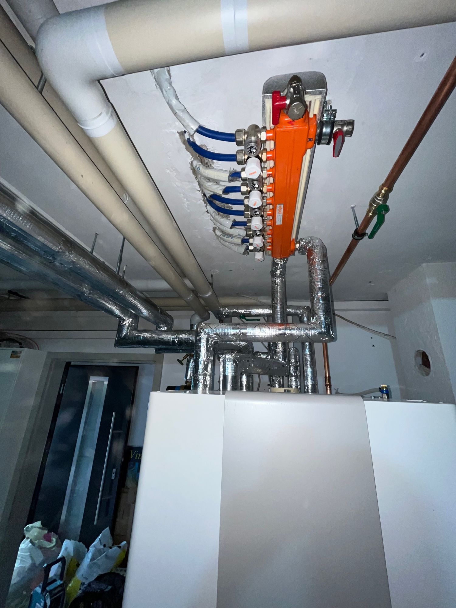 Die Rohrleitungen, Wärmepumpe, Pufferspeicher und Heizkreise wurden hydraulisch verbunden und auf Effizienz geprüft. Anschließend wurde die Fußbodenheizung direkt an die neue Wärmepumpenanlage angeschlossen.
