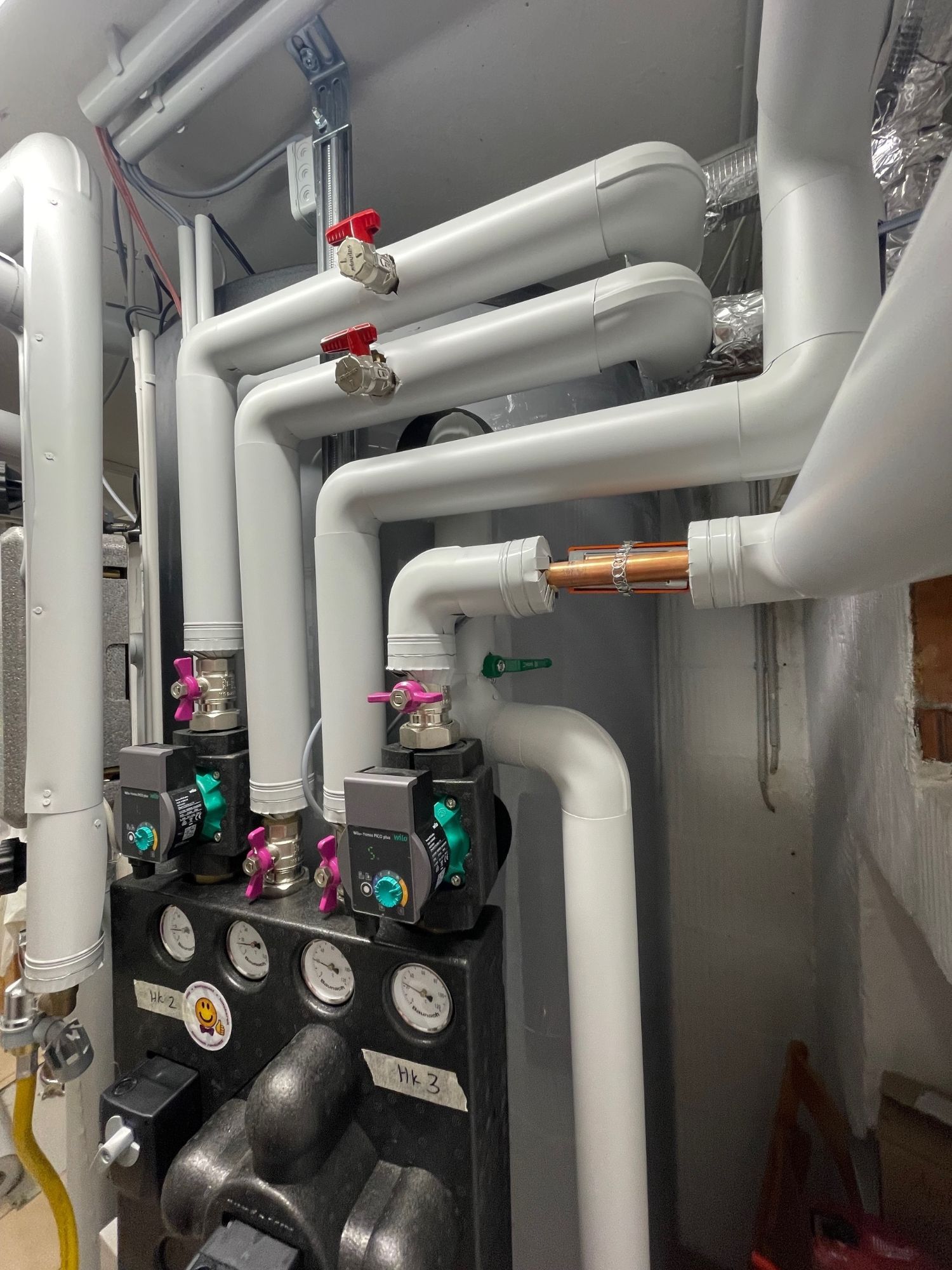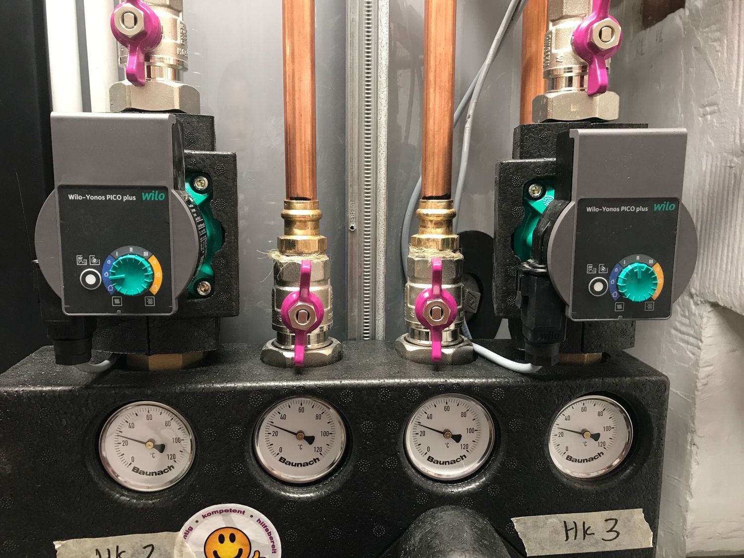 Im Rahmen der Maßnahme wurde außerdem ein hydraulischer Abgleich der gesamten Heizungsanlage durchgeführt. Dabei wurden alle Fußbodenheizungsverteiler und Heizkörperventile im Haus erneuert und optimal auf die neue Wärmeerzeugung abgestimmt.